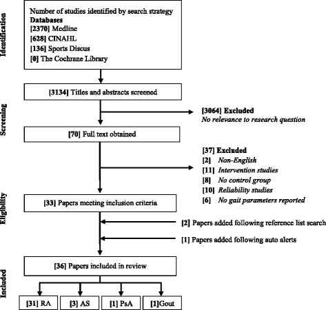 A total of 3134 citations were identified for screening with 36 articles being included for further analysis (Fig. 1). Thirty-one studies evaluated gait parameters in RA [seven, 8, 11, xiii–eighteen, 34–55], three in Equally [10, 56, 57] one in PsA [21] and i in gout [12]. Twenty-four studies examined spatiotemporal gait parameters, with nineteen in RA, two in Every bit, one PsA and gout (Additional file 3: Table S3). Twenty-one studies assessed kinematic parameters, with 17 in RA, three As and one in PsA (Additional file iv: Table S4). X studies examined kinetic parameters with eight in RA, one As and one in PsA (Additional file 5: Table S5). Xvi studies evaluated plantar pressure level parameters, with 15 in RA and 1 in gout (Boosted file half dozen: Table S6). 3 studies assessed all gait parameters (spatiotemporal, kinematic, kinetic and plantar pressures) in the population of interest [11, xiv, xv]. No studies reported gait characteristics in polymyalgia rheumatica, systemic sclerosis and systemic lupus erythematosus. The total number of participants was 2275; 1321 with IA and 954 controls. IA participants included 863 females and 312 males. The hateful (SD) age of IA cases and controls was 52.vi (9.3) and 47.8 (ix.2) years, respectively (Tabular array ane).